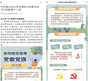 另外,總公司黨委還組織領(lǐng)導(dǎo)班子成員對(duì)《中國共產(chǎn)黨黨徽黨旗條例》內(nèi)容進(jìn)行了學(xué)習(xí),并將如何規(guī)范使用黨旗黨徽的規(guī)定內(nèi)容制作成“云黨課”,下發(fā)各基層黨組織及黨員干部進(jìn)行學(xué)習(xí)。
