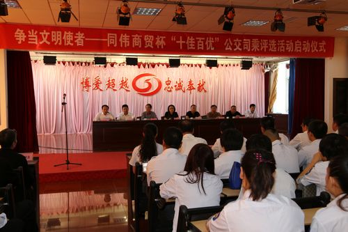 為推進(jìn)唐山市精神文明建設(shè),培育文明禮讓和諧之風(fēng),不斷提升公交服務(wù)質(zhì)量,由唐山市精神文明建設(shè)委員會辦公室、市城管局、市交通運(yùn)輸局、唐山廣播電視臺、市公共交通總公司、同偉商貿(mào)有限公司聯(lián)合舉辦的“爭當(dāng)文明使者—同偉商貿(mào)杯·十佳百優(yōu)公交司乘評選”活動于9月18日正式拉開帷幕。市委宣傳部副部長、市文明辦主任李麗,市委宣傳部副部長、唐山廣播電視臺臺長王力,市城管局副調(diào)研員張志棟,市交通運(yùn)輸局城客處處長楊文強(qiáng),總公司總經(jīng)理趙俊良、黨委書記夏保良和部分班子成員,同偉商貿(mào)有限公司副總經(jīng)理盧志敏出席啟動儀式,司乘代表、乘客代表和新聞媒體代表共計300余人參加了啟動儀式。