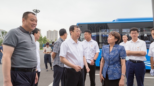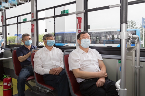 隨后,一行人登上公交車,總經(jīng)理劉東占對(duì)新能源公交車的上線運(yùn)營(yíng)情況,充電站建設(shè)情況,新車電池續(xù)航里程、安全性等方面做了介紹。